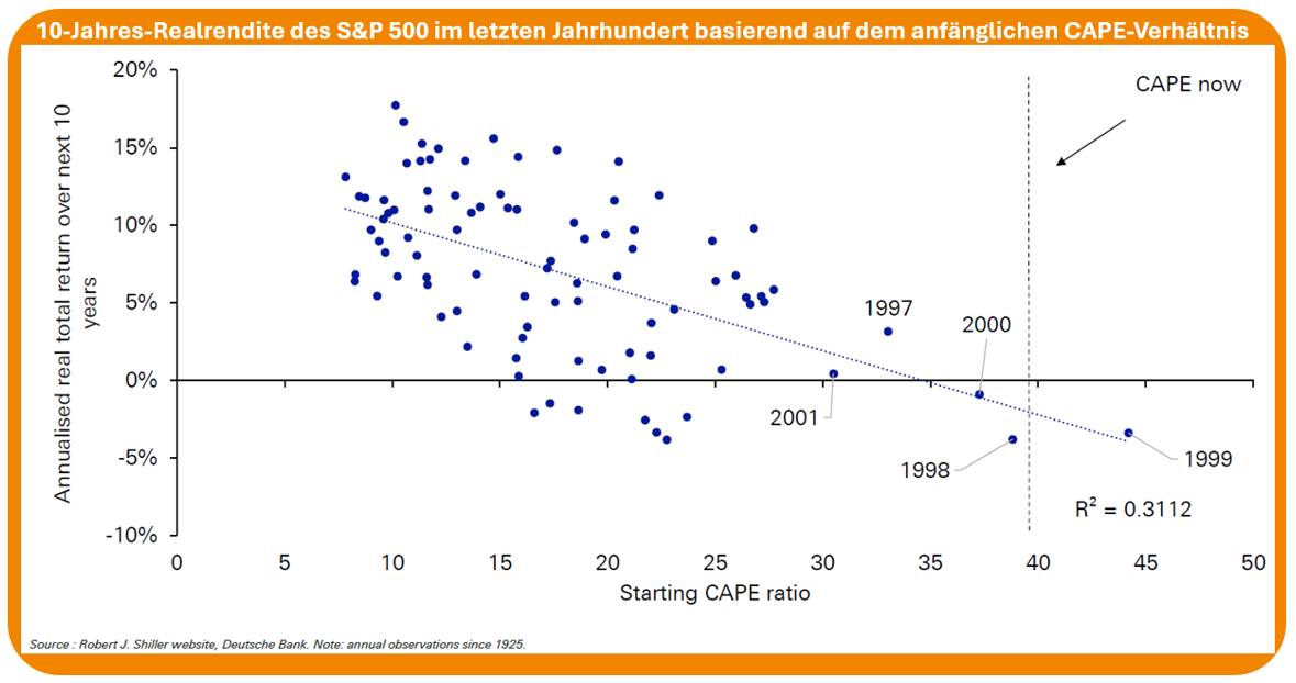 Auch für den US-Aktienmarkt gilt: Hohe Bewertungen gingen historisch mit niedrigeren realen Renditen in den Folgejahren einher, selbst wenn es zwischenzeitlich lange gut lief.