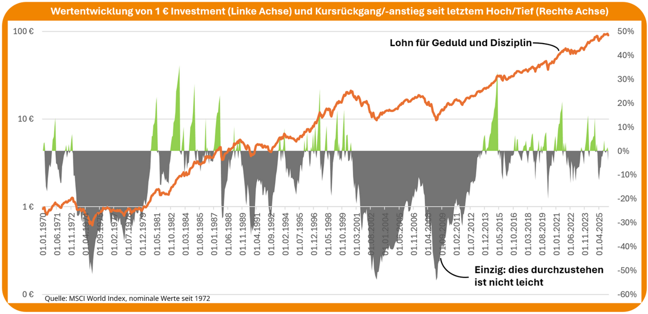 Die Logik des Investierens ist schnell erklärt: Kaufkraft erhalten, Vermögen real wachsen lassen, den Lohn jahrelanger Arbeit nicht durch Inflation auffressen lassen. Das ist der Auftrag. Die Umsetzung ist strukturell auch nicht besonders kompliziert: breit streuen, Kosten niedrig halten, nicht ständig dran rumfummeln. Fertig.