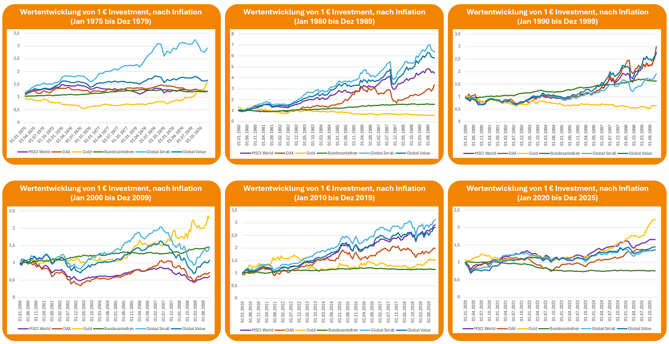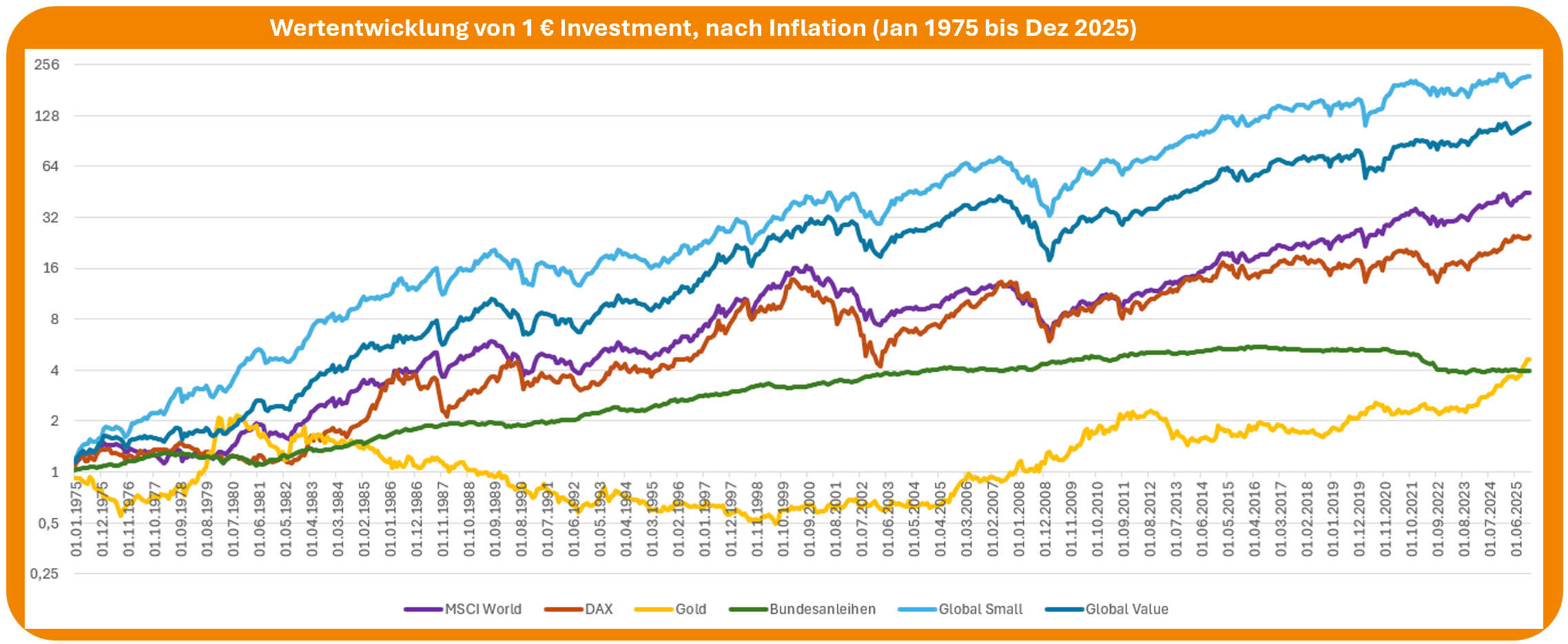 Zurück zur 50-Jahres-Sicht. Gold hat über das halbe Jahrhundert eine respektable Wertentwicklung, aber es kann nicht annähend mit Global Small Caps oder Global Value mithalten. Warum? Weil Gold keine Zinsen zahlt, keine Dividenden ausschüttet und keine Innovationen hervorbringt. Es ist ein Instrument der Angst und des Werterhalts, aber kein Instrument der Wertschöpfung.