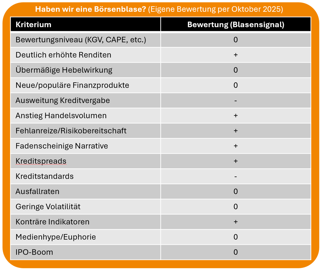Mehrere Kriterien deuten aktuell auf eine Überhitzung hin (u.a. hohe Renditen, Handelsvolumen, Risikobereitschaft, enge Spreads, konträre Indikatoren). Allerdings fehlen klassische Blasensymptome wie extreme Bewertungen, massive Kreditexpansion oder ein spektakulärer IPO- bzw. Medienhype. Die Gesamtlage ist also ambivalent – Warnsignale sind da, aber eine klassische Blase ist (noch) nicht eindeutig zu erkennen. Ein vernünftiger Umgang damit wäre, die Renditeerwartungen zu dämpfen, statt mit einem Zusammenbruch zu rechnen.