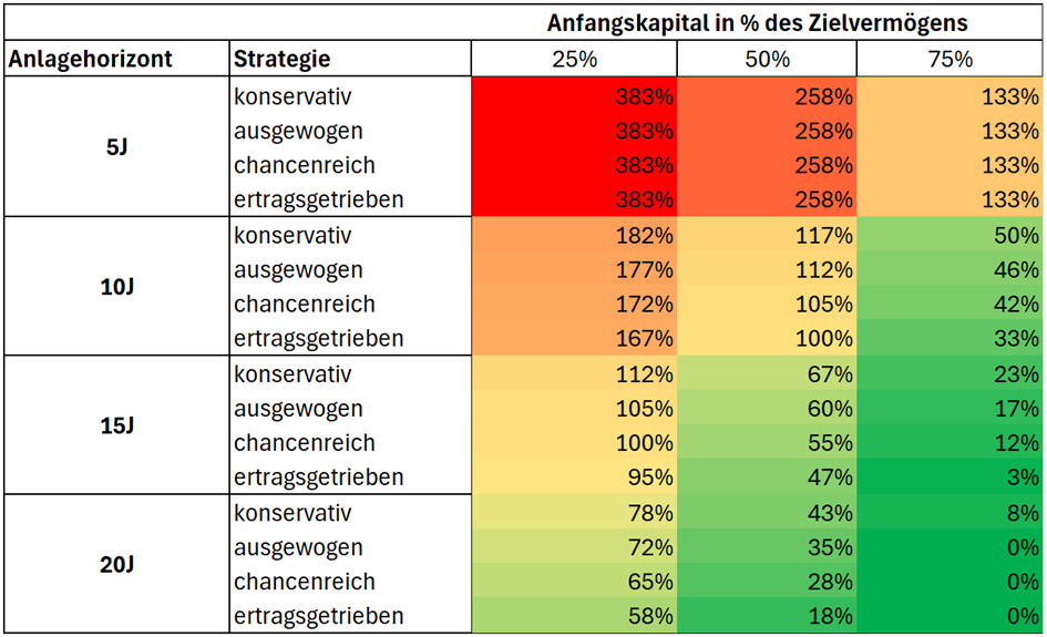 Die folgende Matrix zeigt, wie stark der Anlagehorizont und das Startkapital Einfluss auf die nötige Sparleistung haben. Die Strategie spielt eine Rolle, aber eine deutlich kleinere, als häufig angenommen wird: