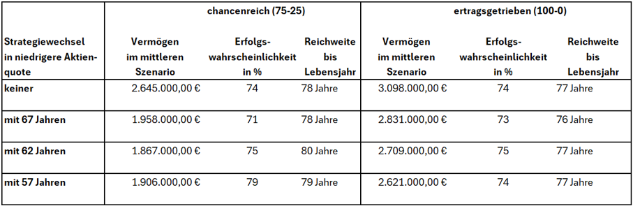 Wir haben zwei verschiedene Strategien untersucht. Die erste ist eine chancenreiche Strategie mit 75 % Aktien und 25 % Anleihen. Die zweite ist eine ertragsgetriebene Strategie, die komplett auf Aktien setzt. Zusätzlich haben wir verschiedene Zeitpunkte getestet, zu denen man in eine Strategie mit einem höheren sicheren Anteil (Anleihen) umschichtet: 10 Jahre vor dem Ruhestand, 5 Jahre vor dem Ruhestand oder genau zu Beginn des Ruhestands. Mit einer Monte-Carlo-Simulation haben wir wieder viele mögliche Marktentwicklungen durchgerechnet, um die Erfolgswahrscheinlichkeit, das Vermögen am Ende des Lebens und die Reichweite im schlechtesten Szenario zu überprüfen.