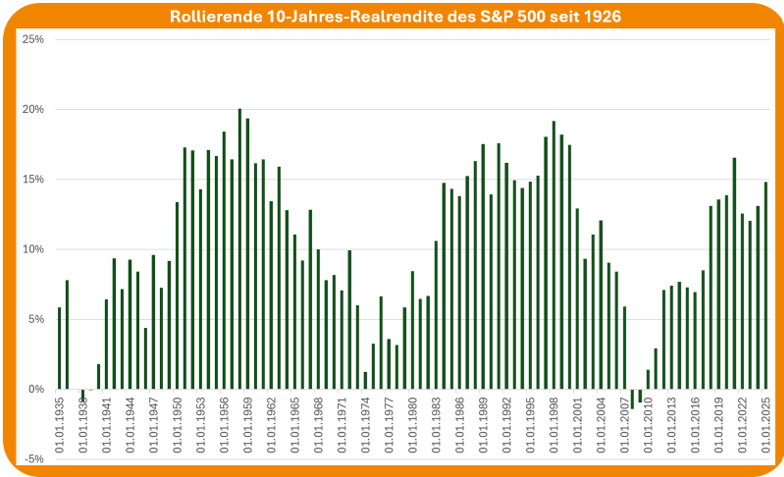 Einzig die starke Position von US-Large-Cap-Aktien (S&P 500) springt ins Auge. Sie dominieren die obere Tabellenhälfte, oft sogar den Spitzenplatz. Das mag den Eindruck erwecken, als sei dies die "sichere Bank" der letzten Dekade gewesen. Doch ein Blick auf die rollierenden 10-Jahres-Renditen des S&P 500 seit 1926 zeigt ein anderes Bild: Auch US-Large Cap Aktien bewegen sich in Zyklen. Auf Phasen überdurchschnittlicher Renditen folgten immer wieder Phasen mit unterdurchschnittlichen Ergebnissen.