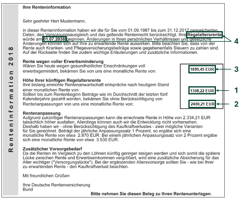 2. Hierbei handelt es sich um eine Hochrechnung Ihrer Bruttorente, wenn Sie die Beiträge der letzten 5 Jahre bis zur Regelaltersgrenze weiterzahlen, ohne dass bis dahin weitere Rentenerhöhungen stattfinden. Achtung: Die Höhe beruht auf der Annahme, dass das Durchschnittseinkommen aller Versicherten zukünftig gleich bleibt. In der Realität wird es jedoch fast in jedem Jahr Lohnerhöhungen geben. Wenn Sie Ihr Gehalt nicht mit der durchschnittlichen Lohnentwicklung steigern können, könnte Ihre Rente niedriger als auf der Mitteilung ausfallen. Darunter im Abschnitt „Rentenanpassung“ finden Sie eine Hochrechnung Ihrer Bruttorente, unter einer jährlichen 1-2 % - Erhöhung der Rente.